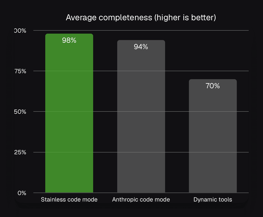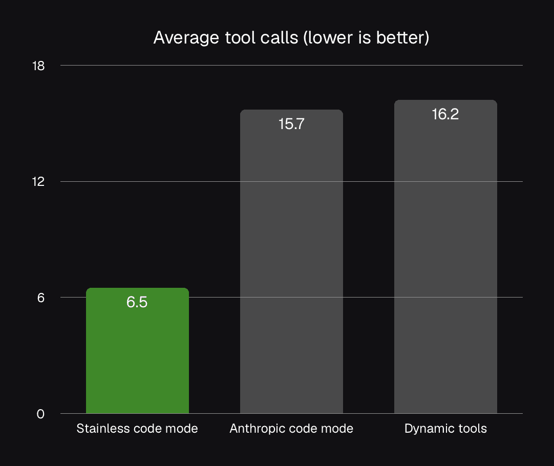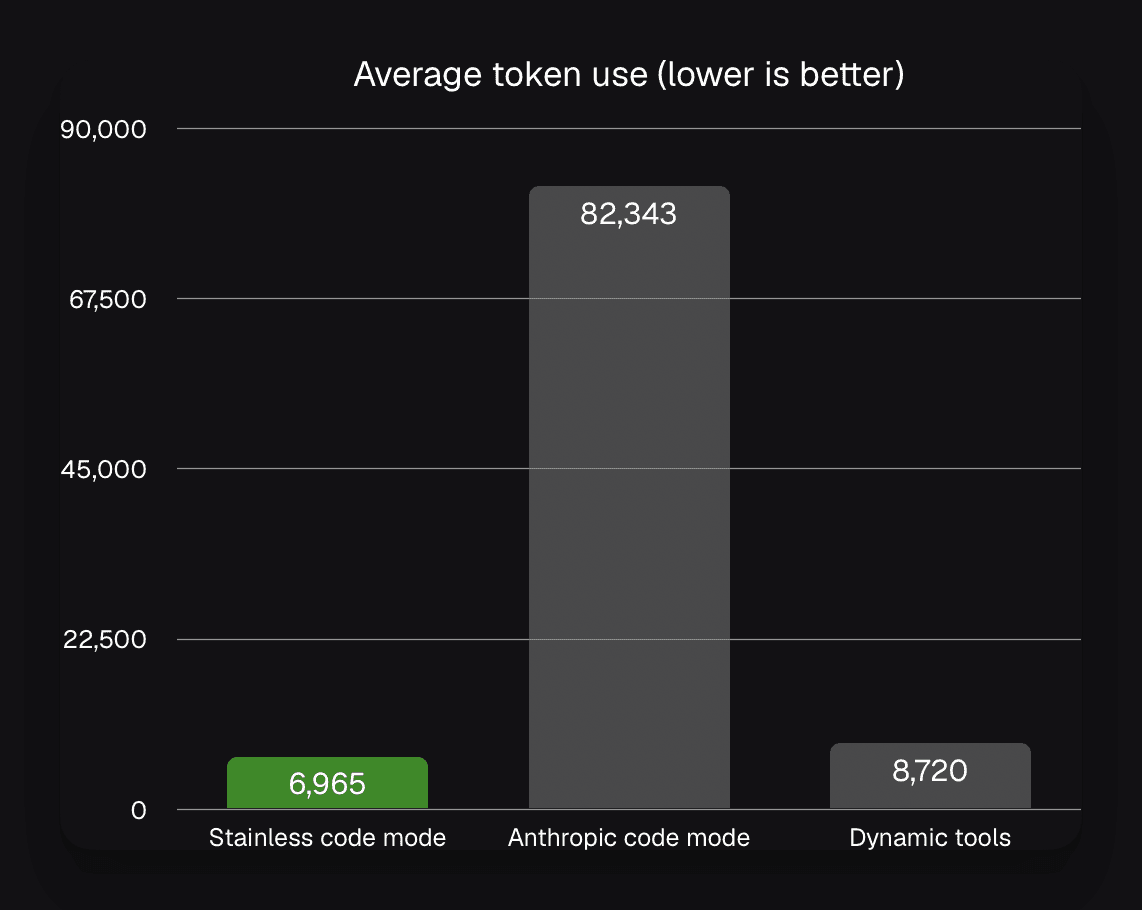 Stainless Code Mode outperforms in task accuracy, uses a fraction of the tokens by eliminating unnecessary data dumps, and drastically reduces the "thinking time" required for complex tasks.