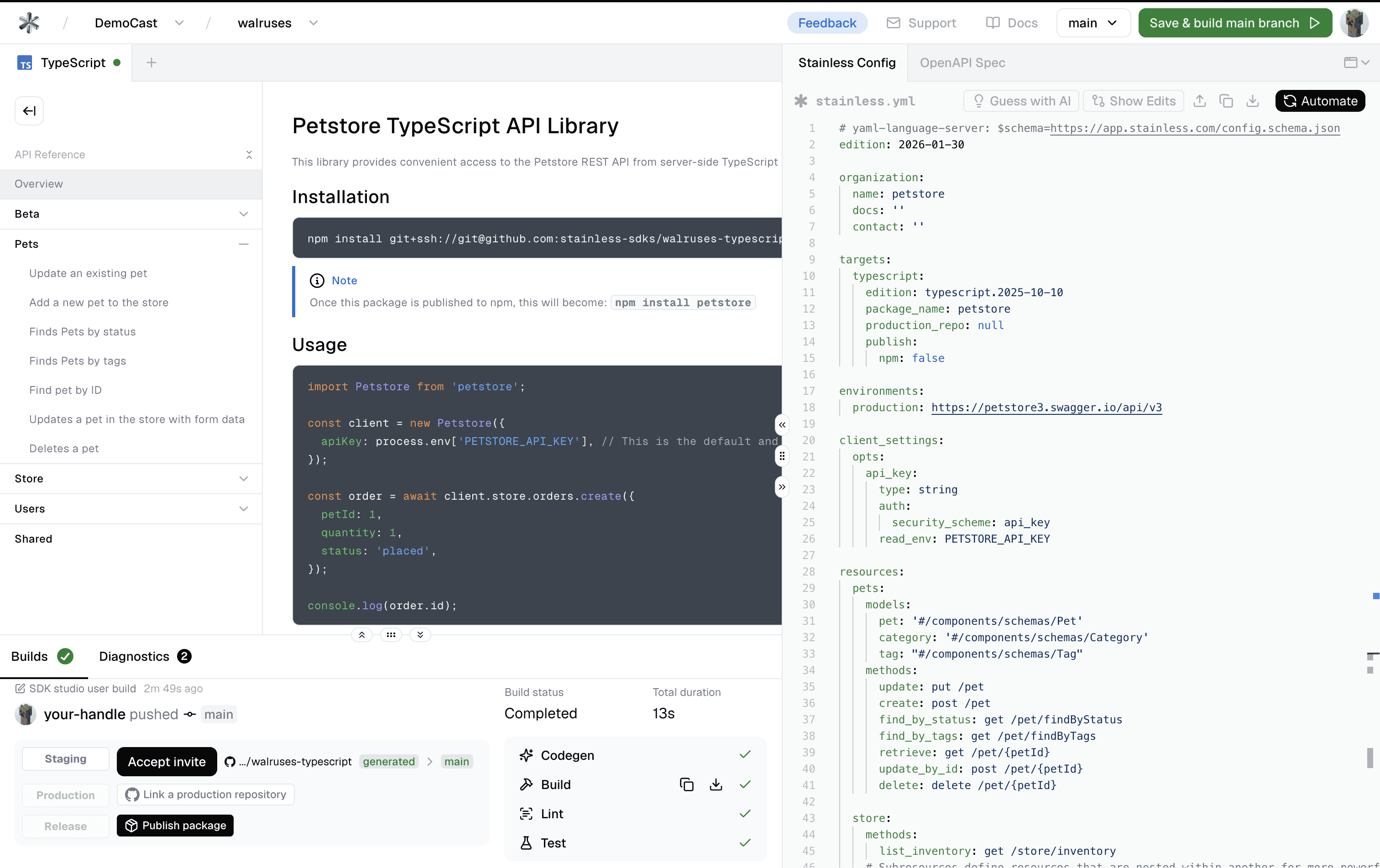 Once you create the project project, Stainless generates a TypeScript SDK and opens it in the Studio inside the dashboard. Stainless also invites you to a GitHub repository containing the generated SDK code.