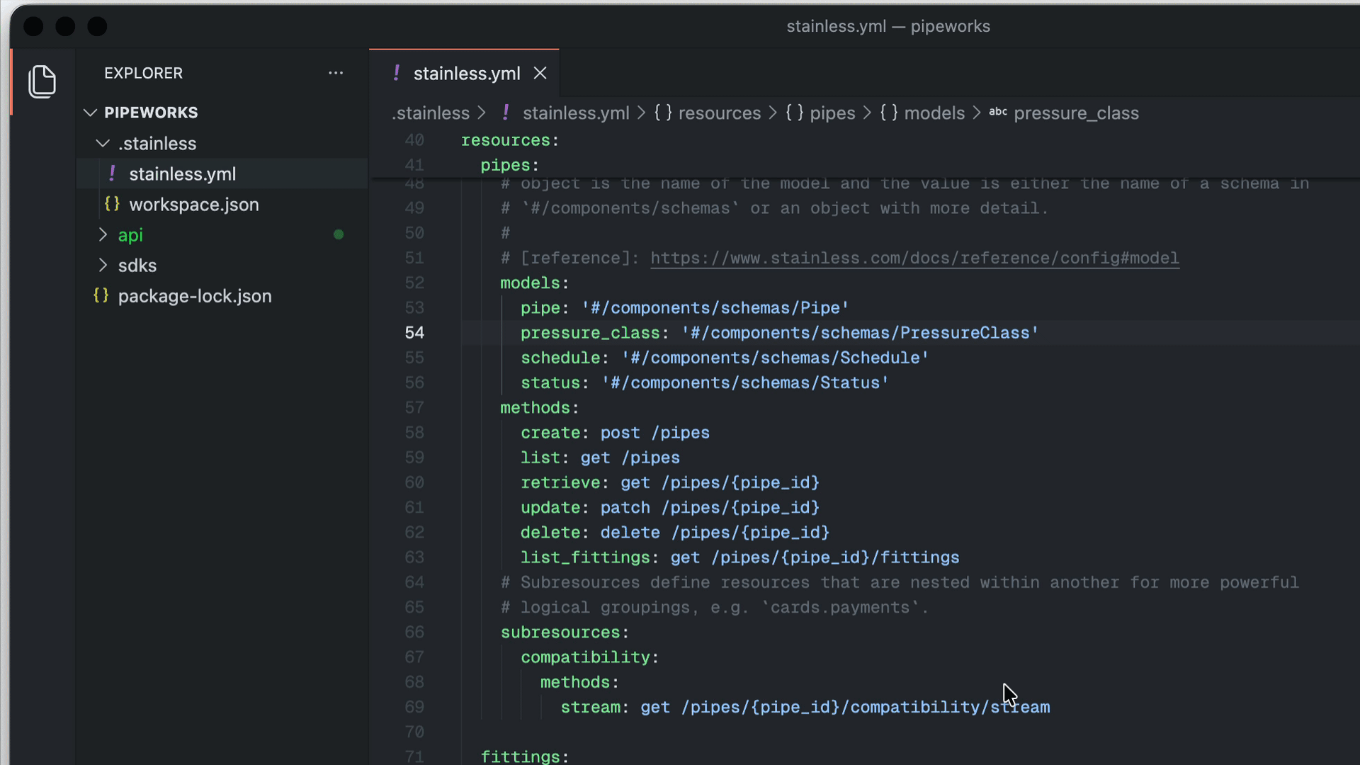 You can use "Go to definition" to jump from a reference in your Stainless config straight to the corresponding schema, parameter, or endpoint in your OpenAPI spec. Use "Find all references" to see where a particular schema or endpoint is used across both files.
